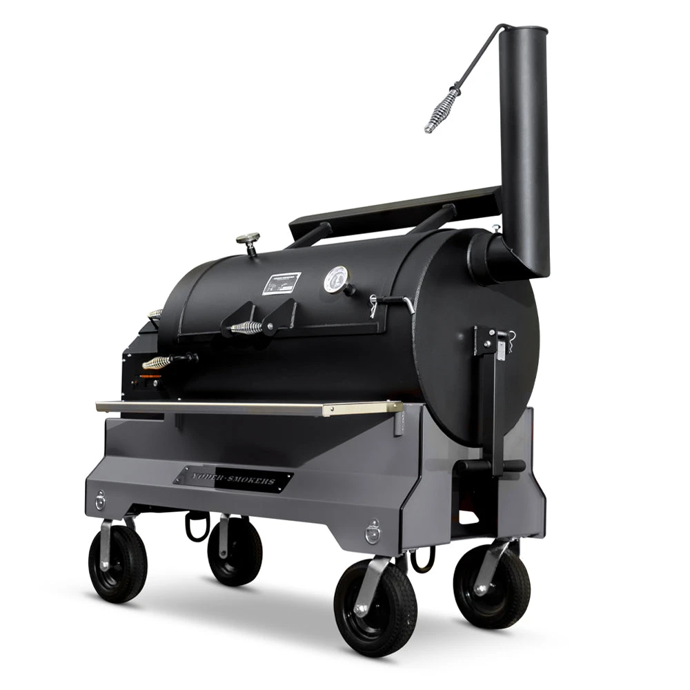 Our customers asked for it, and here it is. The Yoder Smokers YS1500S Pellet Grill redefines versatility. We’ve incorporated the Yoder Smokers ACS Adaptive Control System with our patented Heat Management System found in our offset wood pits. The Heat Management System gives the pitmaster outstanding temperature control from one side of the grill to the other, making it easy to grill a bunch of steaks, fill it full of butts and briskets or cook an entire competition on it. Mounted on our competition cart with 10″ flat-free-tires you have exceptional style and unmatched mobility from your trailer to the cooking position. That’s Yoder listening to your requests and delivering.